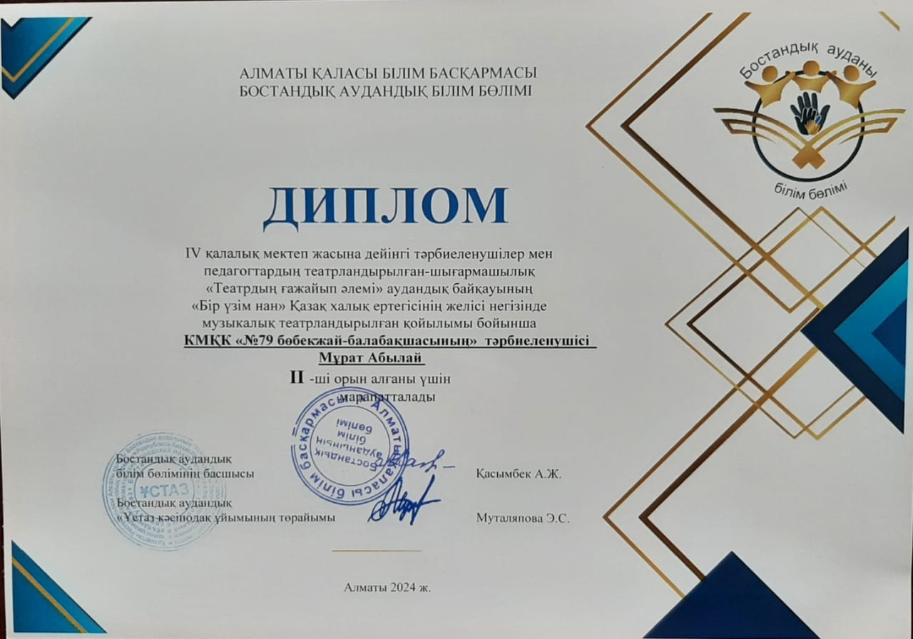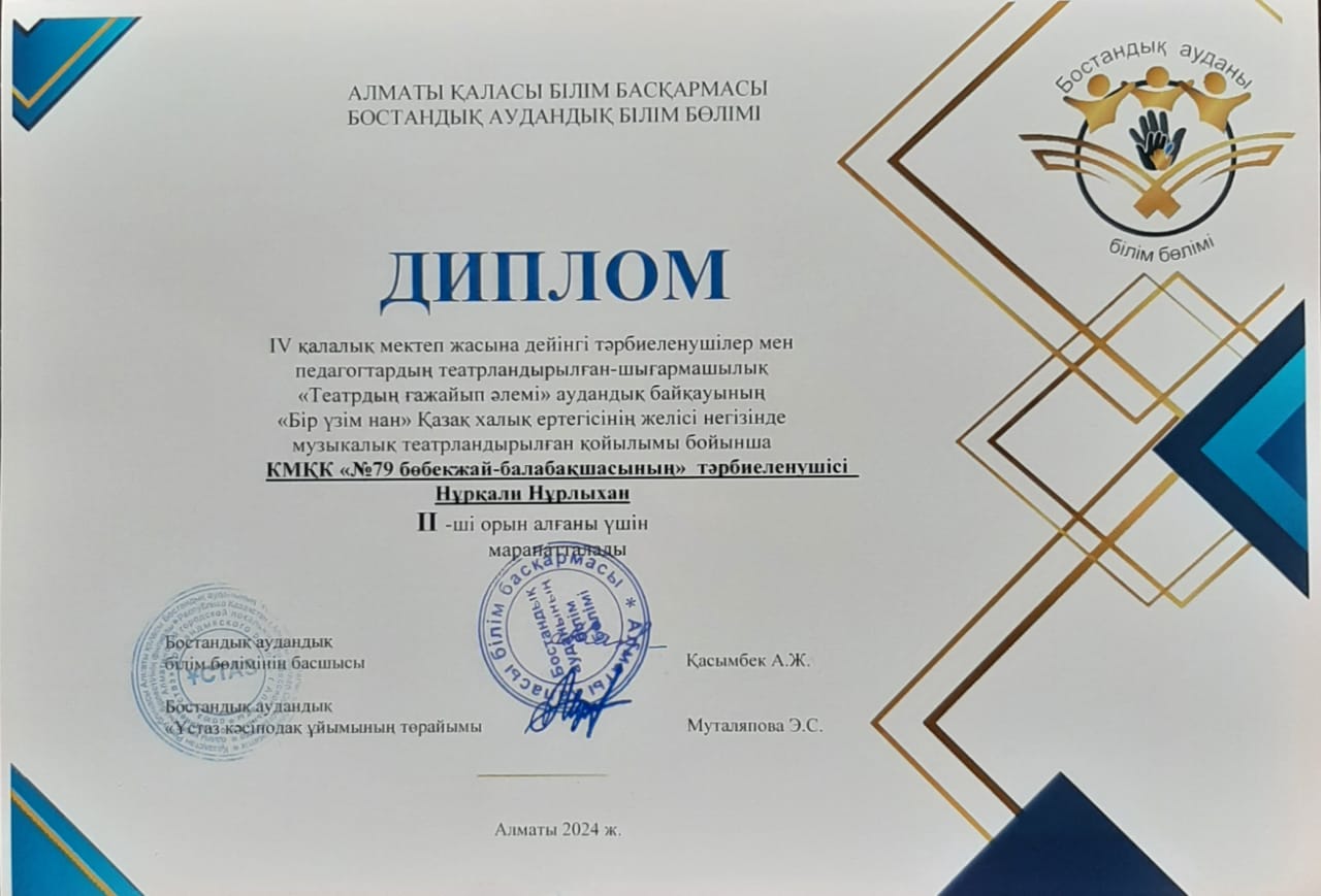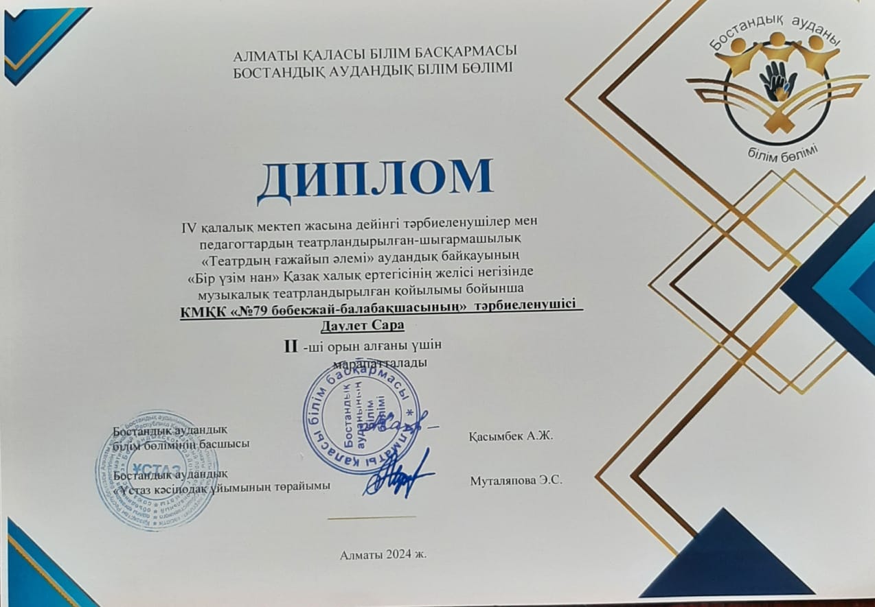 IV қалалық мектеп жасына дейінгі тәрбиеленушілер мен педагогтардың театрландырылған-шығармашылық "Театрдың ғажайып әлемі" аудандық байқауының " Бір үзім нан"  Қазақ халық ертегісінің желісі негізінде музыкалық театрландырылған қойлым бойынша II орынмен  марапатталды.