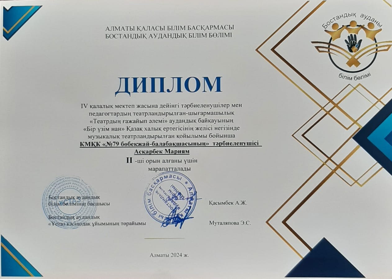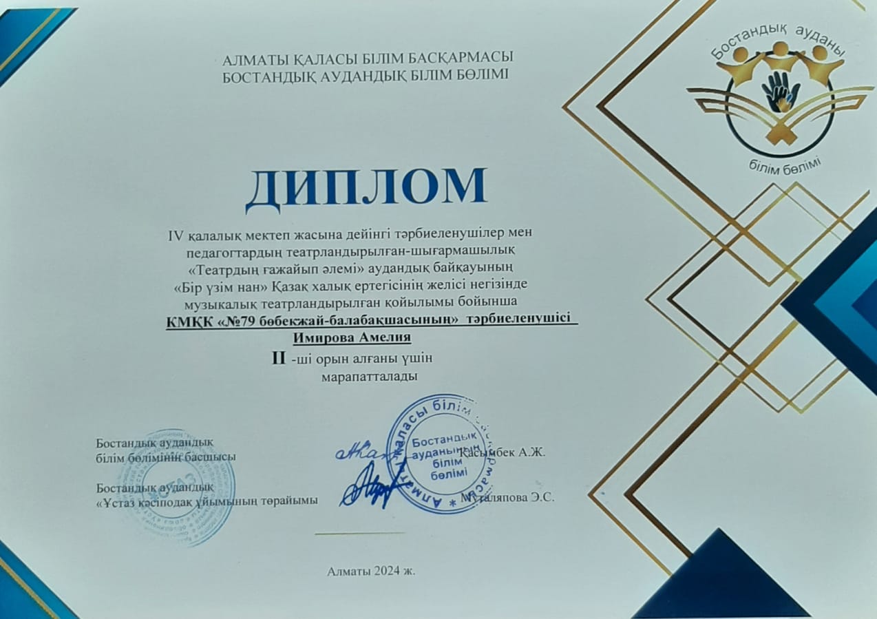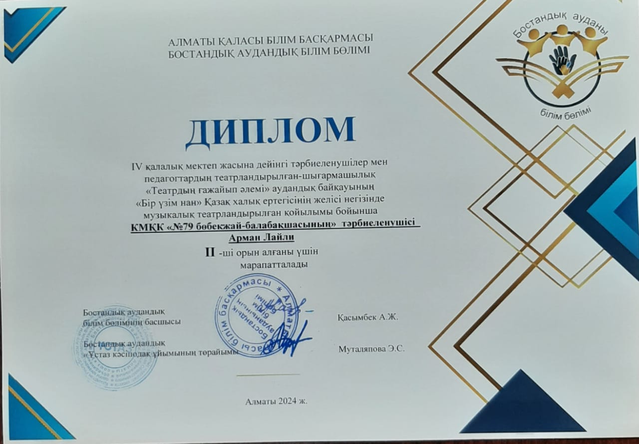 IV қалалық мектеп жасына дейінгі тәрбиеленушілер мен педагогтардың театрландырылған-шығармашылық "Театрдың ғажайып әлемі" аудандық байқауының " Бір үзім нан"  Қазақ халық ертегісінің желісі негізінде музыкалық театрландырылған қойлым бойынша II орынмен  марапатталды.