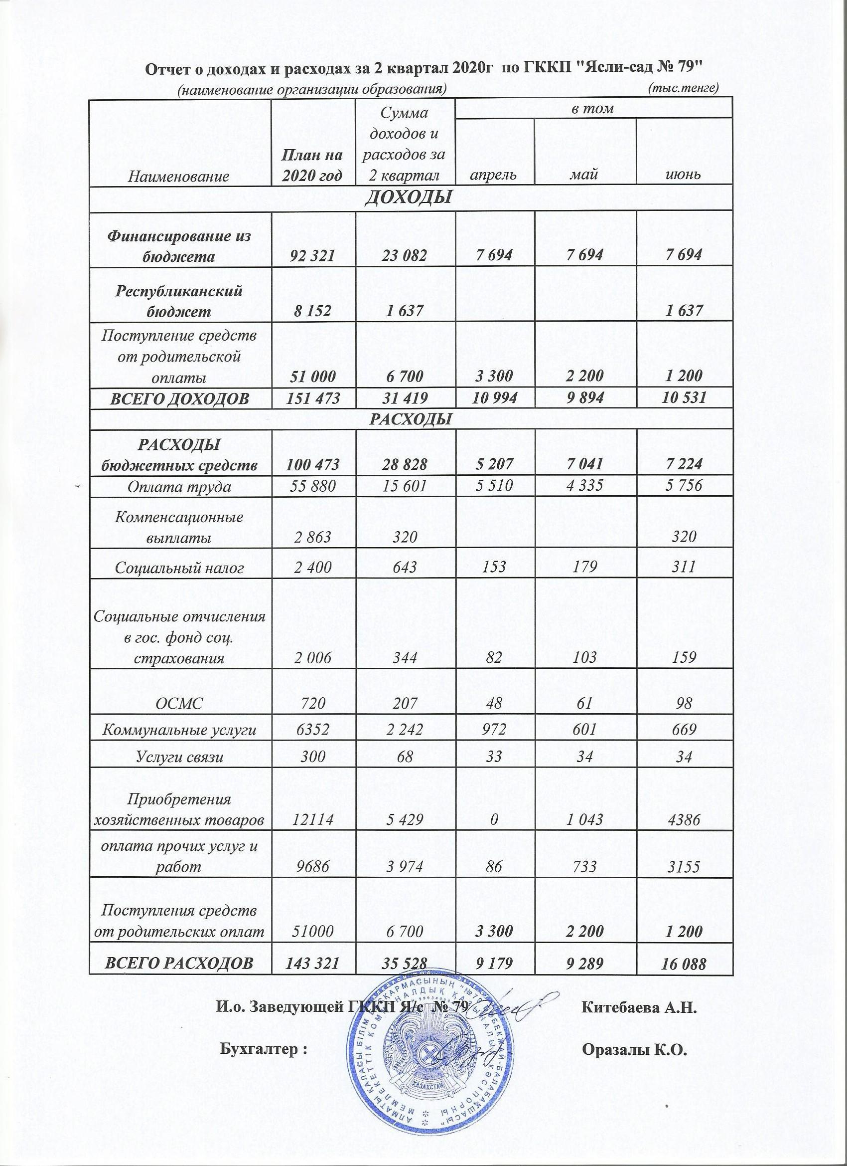Отчет доход и расход за 2 квартал 2020 год » КГКП "Ясли сад №79"